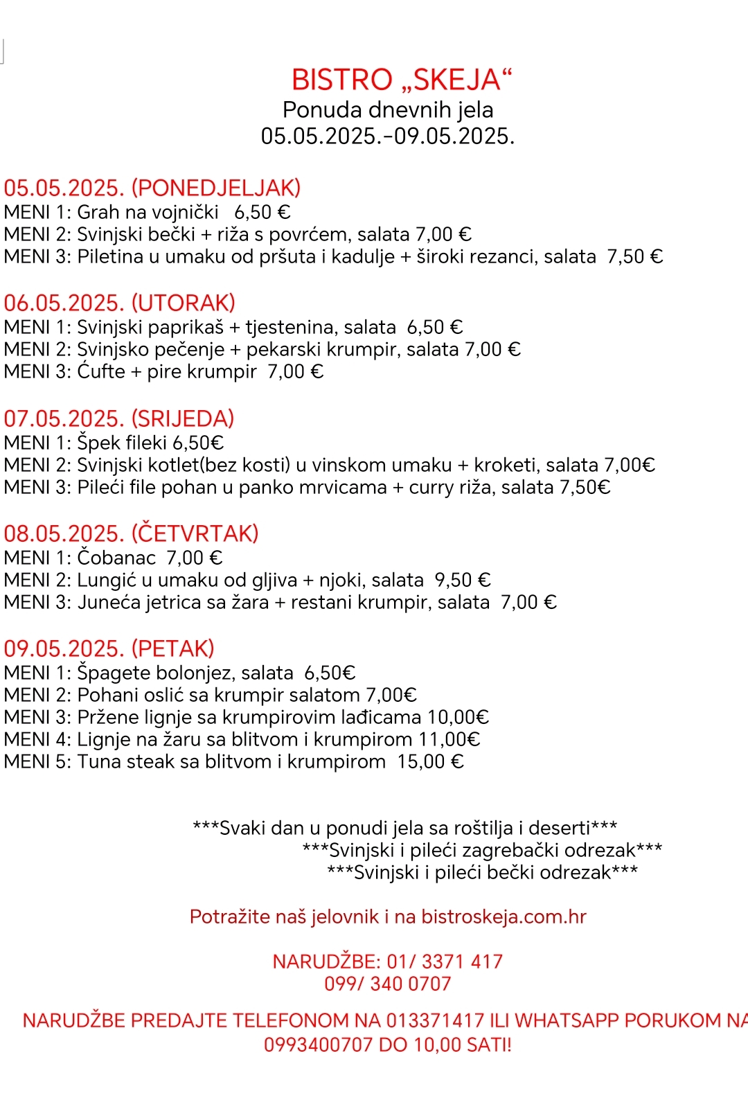 Bistro Skeja Gableci, domjenci i sve vrste proslava Dobra hrana | Dobra zabava Dobrodošli Bistro Skeja oduševljava goste još od 2009. godine Sa strašću prema gastronomiji i posvećenošću kvaliteti, naš bistro nudi autentične okuse i srdačnu dobrodošlicu svim gostima. Više o nama Radno Vrijeme Pon - Sub | 07:30 : 15:30 Naš Tjedni Meni Kvalitetni sastojci, Ukusna jela Dobra hrana | Dobra zabava Proslave Radimo sve vrste proslava! Uživajte u svakodnevnoj ponudi gableca te raznim proslavama kao što su domjenici, rođendani, krštenja, pričesti i krizme u našem bistrou. Iskusite jedinstvenu atmosferu i ukusnu hranu u Bistrou Skeja! KONTAKT